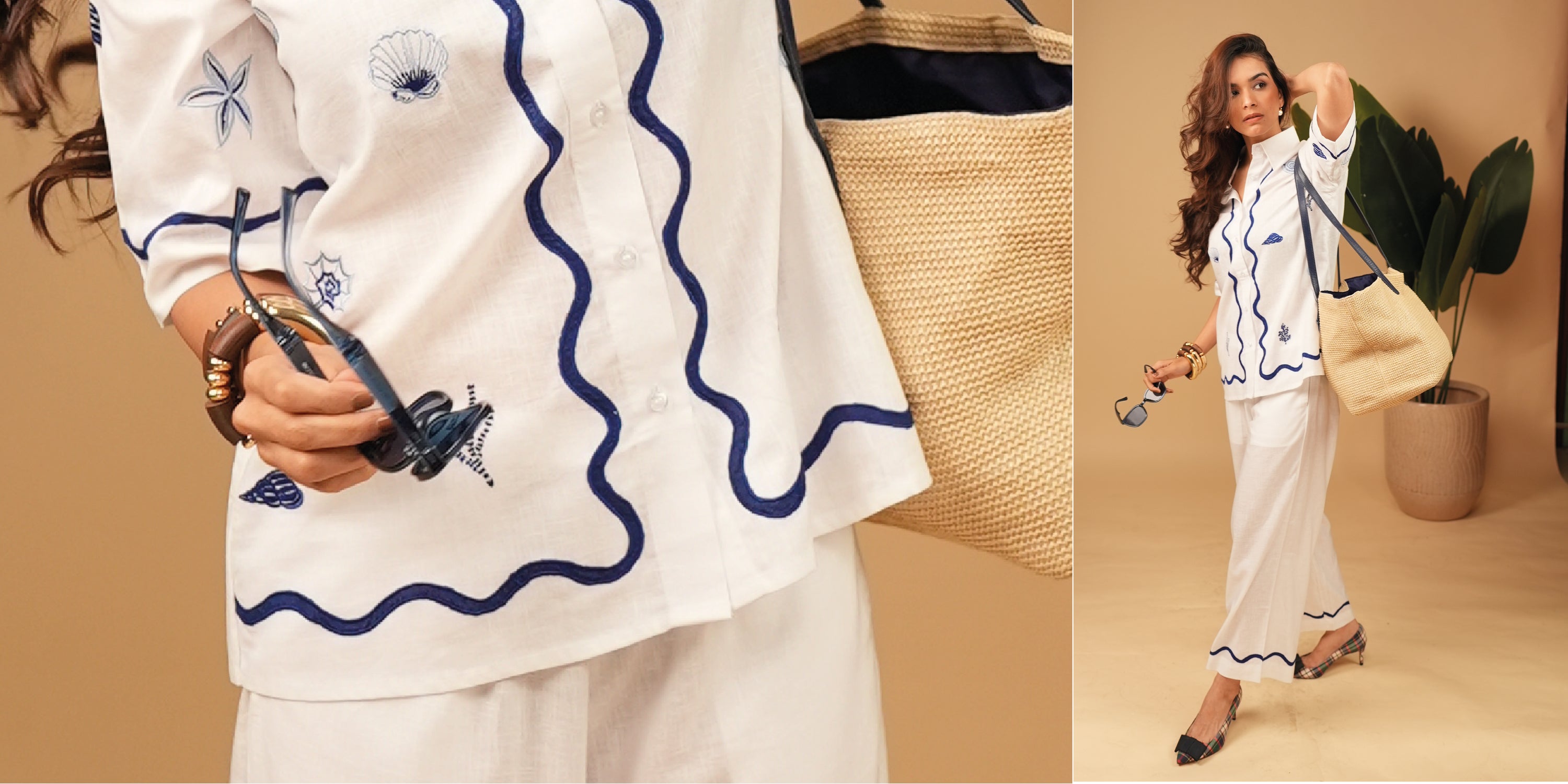 Crisp, breezy, and effortlessly striking‚ this co-ord is crafted in linen for comfort that lasts all day. The collared half-sleeve shirt features bold blue embroidered lines with scattered shell-inspired details, paired with straight trousers finished with a matching embroidered hem. A set that balances ease with statement detailing, perfect for both relaxed days and elevated evenings.